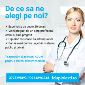 ÎNSCRIERILE se fac cu programare telefonică, la sediul Școlii Postliceale Sanitare ,,Sf. Vasile cel Mare’’ Ploiești din B-dul București nr. 39, Corp AT4-8 (incinta UPG Ploiești)